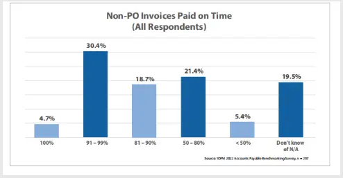 When the payment promptness for non-PO invoices is correlated with invoice volume, we see that this poses the greatest challenge for organizations dealing with high volume of invoices. This is likely because these invoices require research to determine approvers and get their sign-off, which may be more difficult in large organizations.