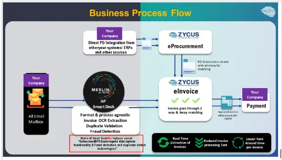 Zycusโ Merlin AP Smart Desk is an AI-powered invoice extraction and supplier communications accounts payable solution that provides fully automated and AI-powered two & three-way matching, contract & payment terms compliance guidance, and full visibility into spend.