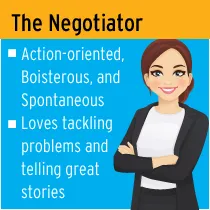 Action-oriented, boisterous, and spontaneous, fun-loving. Negotiators love tackling problems as they arise and telling great stories about their solutions afterward.